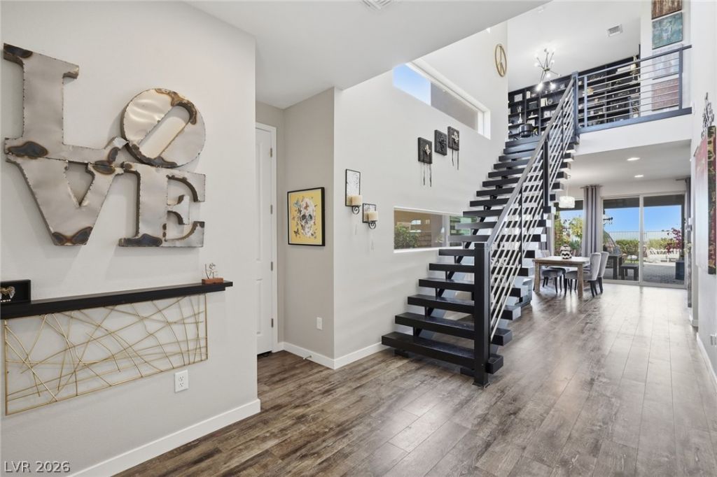 Welcome to the Next Level of Summerlin Luxury. Located in the gated Reverence community, this stunning 2-story home features unobstructed Strip, city, and mountain views. This 3 bed, 3 bath fully loaded floor plan includes a den downstairs and a loft upstairs. The open-concept great room and chef's kitchen with a massive island create a seamless indoor-outdoor flow. The architectural centerpiece is the upgraded floating staircase. Most stairs just get you to the next floor, but this one takes the home to the next level. Step outside to a low-maintenance backyard oasis with a spa and panoramic skyline views. Upgrades include timeless finishes, epoxy garage floors, and a Tesla charger. Seller will pay off solar with a full-price offer! Minutes from Downtown Summerlin, freeway access, and Red Rock trails. A rare turnkey opportunity.